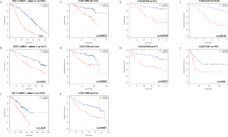 Figure 5: Kaplan-Meier estimates of other survival data of breast cancer patients according to the risk scores. Net-score examined overall Survival (OS) in METABRIC cohort 1, 2 and 3 (A-C). OS, Distant Meta Free Survival (DFS) and Relapse Free Survival (RFS) in GSE7390 (D-F), OS and RFS in GSE42568 (G, H), DFS in GSE22219 (I), and DFS in GSE37181 (J) were stratified by Net-score. p value was calculated by log-rank test.