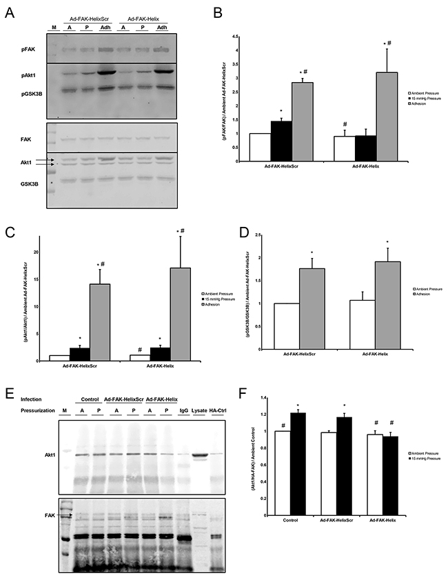 Figure 3: (A) Lysate from Ad-FAK-HelixScr and Ad-FAK-Helix infected cells exposed to ambient (A) or 15 mmHg (P) while in suspension, or allowed to adhere to collagen I (Adh) were probed for phospho- (top) and total (bottom) FAK, Akt1, and GSK3B. Blots were cut at the level of 75 kD,, and the higher weight bands were incubated with pFAK/FAK (125 kDa) antibodies while the lower weight bands received pAkt1/Akt1 (60 kDa) and pGSK3B/GSK3B (46 kDa) probes. (B) In suspended cells, pFAK increased following 15 mmHG exposure vs. exposure to ambient atmosphere in Ad-FAK-HelixScr, but not Ad-FAK-Helix infected cells. In contrast, adhesion increased FAK phosphorylation over suspended cells at ambient pressure in both Ad-FAK-HelixScr and Ad-FAK-Helix infected cells. (C) Both Ad-FAK-HelixScr and Ad-FAK-Helix virus infected cells exhibited increased Akt1 phosphorylation after exposure to 15 mmHg pressure as well as after adhesion. (D) GSK-3β phosphorylation also increased in both the virus treated cells in response to adhesion; however, in pressure treated groups, GSK-3β phosphorylation decreased in the Ad-FAK-HelixScr but not the Ad-FAK-Helix virus treated cells (n = 4-8, * p < 0.05 vs. ambient Ad-FAK-HelixScr, # p < 0.05 vs. 15 mmHg Ad-FAK-HelixScr). (E) HA/HA-FAK coimmunoprecipitated Akt1 (top) to produce a western signal which was normalized to the respective amount of FAK signal (bottom). The samples are grouped by viral infection, uninfected (Control), Ad-FAK-HelixScr, or Ad-FAK-Helix, and then subdivided by exposure to ambient (A) or 15 mmHg pressure (P). All cells were transfected with HA-FAK except the HA-Ctrl cells which were transfected with a plasmid expressing the HA tag alone. A marker (M) and 40 μg of SW620 whole cell lysate were used as a references for Akt1 and FAK. (F) Exposure to pressure increased Akt1 coimmunoprecipitation in control SW620 cells or cells infected with Ad-FAK-HelixScr. Pressure did not increase Akt1 coimmunoprecipitation in SW620 cells infected with Ad-FAK-Helix (n = 6, * p < 0.05 vs. ambient pressure, # p < 0.05 vs. 15 mmHg Ad-FAK-HelixScr).