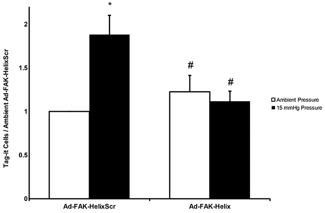 Figure 5: A FAK-derived peptide blocks pressure stimulation of adhesion of cancer cells to murine surgical wounds. Tag-it-labeled, Ad-FAK-HelixScr virus treated cells displayed increased wound implantation under elevated pressure conditions, after assay by complete excision of the wound and flow cytometric quantitation of labelled cells in wound tissues. Treatment with the Ad-FAK-Helix blocked this effect (n = 14, * p < 0.05 vs. the paired ambient pressure group, # p < 0.05 vs. 15 mmHg Ad-FAK-HelixScr).