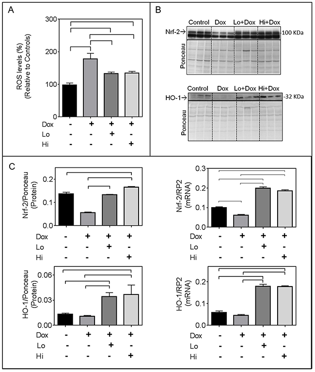 Figure 2: FGF-2 isoforms attenuate the effects of Doxorubicin on reactive oxygen species (ROS), Nrf-2 and its downstream target heme oxygenase 1 (HO-1). Panel (A) Relative ROS as measured by the fluorescence intensity of the 2’,7’ –dichlorofluorescin diacetate (DCFDA), n=8, in the absence or presence of Dox and FGF-2 isoform pre-treatment, as indicated. (B) Western blots for Nrf-2, and HO-1, as indicated. Nrf-2 migrates as a 100 kDa band, while HO-1 is at 32 kDa. Quantitative assessments of immunoreactive bands are included in panel C. Panel (C) relative Nrf-2 and HO-1 protein (n=3) as well as corresponding mRNA levels, assessed by q-PCR, (n=4), as indicated. For the mRNA or protein determinations, cardiomyocytes were exposed to Dox for, respectively, 8 or 24 hours, in the presence and absence of Lo- or Hi-FGF-2 pre-treatment. For western blot analysis, the densitometry values of the probed proteins were corrected using the densitometry values of the whole lane Ponceau S stain of the same membrane. For qPCR analysis, all target RNA levels were normalized to rat RNA polymerase II (RP2) levels. Data is plotted as mean ± SEM. Bracket indicate groups whose values are show statistically significant differences, P<0.05)