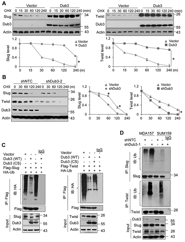 Figure 3: Dub3 de-ubiquitinates Slug and Twist. (A) Flag-Slug or HA-Twist was co-expressed with Myc-Dub3 or control vector in HEK293 cells. After the cells were treated with cycloheximide (CHX) for indicated time intervals, expression of Slug, Twist and Dub3 was examined by western blot analysis. (B) MDA-MB157 cells stably transfected with control or Dub3 shRNA were treated with CHX. Expression of endogenous Slug, Twist and Dub3 was examined. The intensity of Slug/Twist expression for each time point was quantified by densitometry and plotted (bottom panel). The experiment was repeated three times and a representative experiment is presented. *p value < 0.001; (C) Flag-Slug or Flag-Twist was co-expressed with HA-ubiquitin and either WT or CS Dub3 in HEK293 cells. After cells were treated with MG132, Slug and Twist proteins were immunoprecipitated and poly-ubiquitination of Slug and Twist detected by western blot analysis using HA antibody. (D) MDA-MB157 and SUM159 cells stably transfected with control or Dub3 shRNA were treated with MG132. Cell extracts were immunoprecipitated with Slug or Twist antibody and the poly-ubiquitination of Slug and Twist detected by western blot analysis.