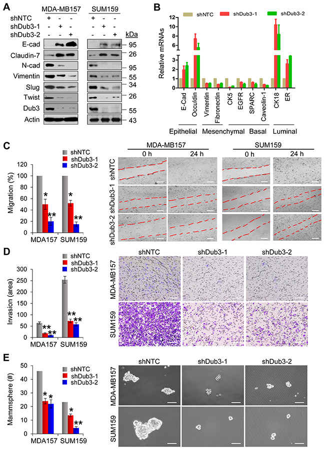 Figure 4: Knockdown of Dub3 inhibits migration, invasion and CSC-like characteristics of BLBC cells. (A) MDA-MB157 and SUM159 cells stably transfected with control or Dub3 shRNA were examined by western blot analysis for expression of various protein markers as indicated. (B) The mRNA levels of various markers as indicated were quantitated by real-time PCR (mean ± SD in three separate experiments). (C) Wound healing assay of MDA-MB157 and SUM159 cells with or without stable knockdown of Dub3. Data were presented as mean ± SEM. (D) Boyden chamber invasion assay of MDA-MB157 and SUM159 cells with or without stable knockdown of Dub3. Data were presented as mean ± SEM. (E) Quantification of tumorsphere from MDA-MB157 and SUM159 cells stably expressing control or Dub3 shRNA (mean ± SD from three independent experiments) (left panel). Representative images were shown (right panel). Scale bar = 100 μm. **p value < 0.01; *p value <0.05.