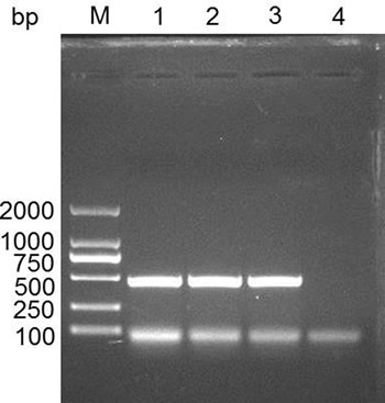 Figure 1: Cloning the IFITM3 gene in swine spleen tissue. M, DL2000 DNA marker; 1-3, PCR product for swine IFITM3; 4, negative control.
