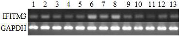 Figure 2: Expression patterns of the IFITM3 mRNA in various swine tissues. 1, skin; 2, muscle; 3, adipose; 4, heart; 5, liver; 6, spleen; 7, kidney; 8, lung; 9, duodenum; 10, jejunum; 11, ileum; 12, cecum; 13, rectum.