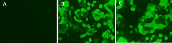 Figure 3: Observation of green fluorescence in PK15 cells transfected with IFITM3 expression vectors. Green fluorescence was observed clearly using fluorescence microscopy in the PBv (B), and PBIFM3 (C) cells, but not in non-transfected PK15 cells (A).