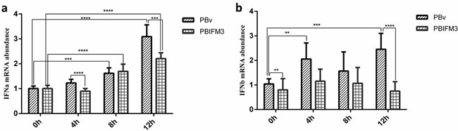 Figure 6: Effect of swine IFITM3 on the expression of IFNα and IFNβ. Graphs demonstrate the expression of IFNα (a) and IFNβ (b) in PBIFM3 and PBv cells stimulated with or without LPS (100 μg/ml). In LPS groups, cells were incubated correspondingly with LPS (100 μg/mL) for 4, 8, 12 h. Cells in 0 h (control) group were cultured in basal medium. **P < 0.01, ***P < 0.001, ****P < 0.0001 vs. PBv or 0 h group.