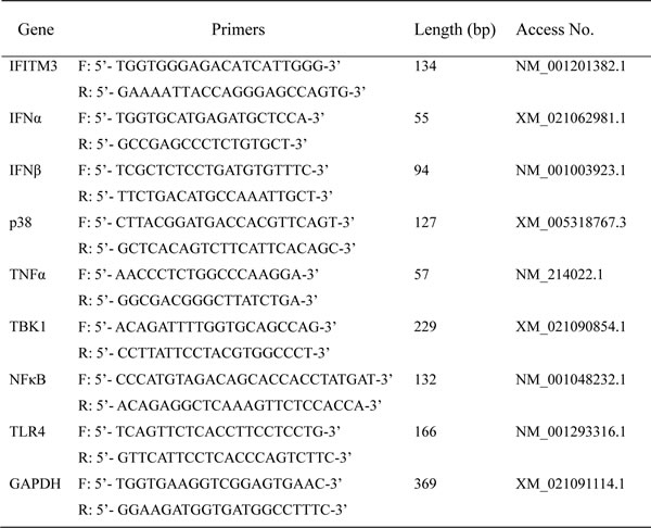 Currently, studies on swine IFITM3, especially regarding its function, are very few. Although previous studies on IFITMs mainly focused on their roles in embryonic development, their functions as host antiviral factors were only recently discovered by RNA interference genomic screening for host factors involved in influenza virus infection [7]. It was subsequently revealed that IFITMs can restrict the early stages of replication for a wide variety of viruses, including Influenza virus, West Nile viruses, Ebola viruses, and Corona virus [7, 8, 12]. Researchers found that IFITM3 gene was mainly isolated from severely inflamed mucosa and considered as a biomarker for ulcerative colitis [6, 13]. Furthermore, IFITM3 expression increased in gastric cancer, and colorectal tumors [14-16]. There exists a positive correlation between the IFITM3 expression levels and the pathological glioma grades [17]. Previous studies have shown that toll like receptor 4 (TLR4) may play a major role in various inflammatory diseases. Literatures demonstrated that TLR4 expression up-regulated in rheumatoid arthritis, systemic lupus erythematosus, and multiple sclerosis [18-23]. Bacterial lipopolysaccharide (LPS), which is recognized by host innate immune receptor TLR4 and subsequently triggers inflammation by activation of a transcriptional factor IFN regulatory factor and nuclear factor-κB (NFκB), resulting in up-regulation of various inflammatory mediators [24].