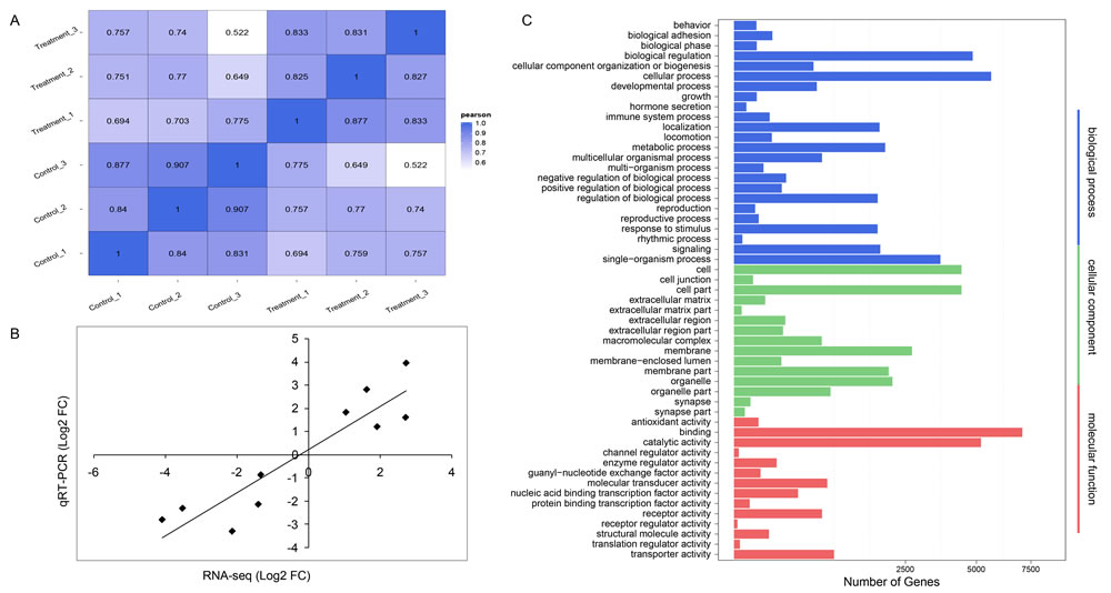 Figure 1: Reliability of deep-sequencing data and functional enrichment analysis. A. Heatmap of Pearson correlation coefficient among different samples. The maximum and minimum values are marked by blue and white respectively. A higher value indicates that the two samples are more similar. B. Correlation of Log2 (fold changes) in miRNA expression between deep sequencing and qRT-PCR results. The relative expression fold change between the control and treatment groups is indicated by black dots. C. GO terms enriched among target genes of differently expressed miRNAs. The x-axis indicates the number of target genes, and the y-axis shows the GO terms. All terms are classified into three subcategories marked by different colors.