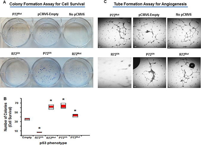 Figure 1: P72 phenotype of p53 induces cell survival and endothelial cell tubular formation. Increased cell survival in cells that express P72wt phenotype or mutant phenotypes compared to cells that express R72wt phenotype (A and B). Conditioned medium of P72wt or mutant phenotypes expressing cells induce HUVEC to form networks of multiple tube-like structures, while conditioned medium of R72wt expressing cells did not support tubule formation (C).