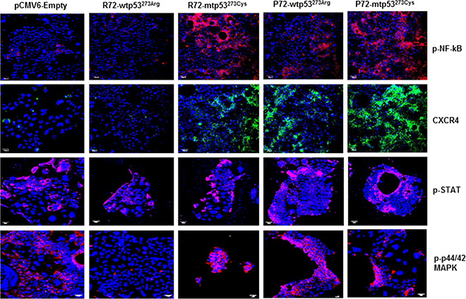 Figure 2: P72 phenotype of p53 is associated with abundance of tumor promoting phenotypes. The expression of p-NF-kB, p-STAT, CXCR4 and p-ERK was found to be higher in the cell model of P72wt or mutant phenotypes than in the vector-control or R72wt cell models.