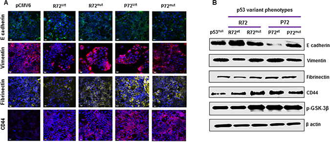 Figure 3: P72 phenotype promotes EMT process (A and B). P72wt or mutant phenotype expressing cells displayed decreased expression of the epithelial signature E-cadherin and increased expression of the mesenchymal signature vimentin, fibrinectin, CD44 and p-GSK-3β.