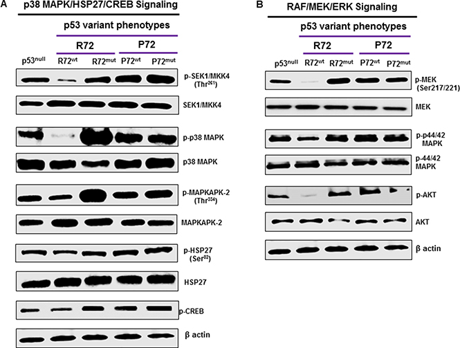 Figure 4: P72 phenotype promotes p38MAPK and RAF/MEK/ERK signaling. Molecular analyses revealed that P72wt or mutant phenotypes effectively induced the activation of p38 MAPK and RAF/MEK/ERK signaling (A and B). Up-regulation of phosphorylated SEK1/MKK4, upstream kinase of p38 MAPK has been found to be associated with P72wt or mutant phenotypes (A). Activation SEK1/MKK4 was accompanied by up-regulation of p-MAPKAPK-2, p-Hsp27 and p-CREB downstream targets of p38 MAPK (A). Suppression of RAF/MEK/ERK activation was significantly higher in cells that express P72wt or mutant phenotypes compared to cells that express R72wt phenotype. This suppression was accompanied by down-regulation of p-Akt (B).