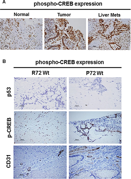 Figure 6: CREB expression in CRC by IHC. Immunostaining confirmed the presence of CREB expression in CRC (A). Compared to normal, the expression of CREB was markedly increased in primary CRC lesion or metastatic CRC lesions (A). (B) IHC confirmed the expression status of CD31, CREB, and p53 in CRC (B). Compared to R72 CRC, the expression of CD31 (tumor angiogenesis) or CREB was markedly increased in P72 CRC. IHC analysis revealed that tumors were found to be negative for p53 expression (p53 wild type) (B).