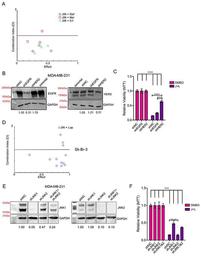 Figure 2: HER2 and JNK1 are Necessary for Maximum Synergy between JNK-IN-8 and Lapatinib. (A) MDA-MB-231 cells were treated with 5μM JNK-IN-8 (JIN) and/or 1, 5, and 10μM gefitinib (Gef), 0.1, 0.5, and 1.0μM neratinib (Ner), or 1, 5, and 10μM erlotinib (Erl). MTT values were used to calculate synergy using CompuSyn software. Combination Indexes (CIs) are plotted against Effect (% decreased cell viability by MTT). Points below 1.0 CI (median line) are synergistic. (B) MDA-MB-231 cells stably expressing either shNC (non-silencing control), shEGFR, or shHER2 and their relative densitometries to shNC for EGFR and HER2 expression by western blot. The non-specific band (denoted by the asterisk “*”) in the HER2 blot was included in densitometry calculation due to its close proximity to HER2. (C) Cell lines with indicated shRNA plasmids were treated with vehicle (DMSO) or 3μM lapatinib and 5μM JNK-IN-8 (J+L) for 72 hours. Cell viability was assayed using MTT and bars represent relative viability compared to vehicle. (D) Sk-Br-3 cells were treated with various concentrations of J+L for 72hrs and assayed for viability using MTT. MTT values were used to calculate synergy using CompuSyn software. Combination Indexes (CIs) are plotted against Effect (% decreased cell viability by MTT). Points below 1.0 CI (median line) are synergistic. (E) MDA-MD-231 cells stably expressing either shNC, shJNK1, shJNK2, or shJNK1 and shJNK2 were lysed for western blot. Their relative densitometries to shNC for JNK1 and JNK2 expression are shown. (F) Cell lines with indicated shRNA plasmids were treated with DMSO or J+L for 72 hours. Cell viability was assayed using MTT and bars represent relative viability compared to vehicle.
