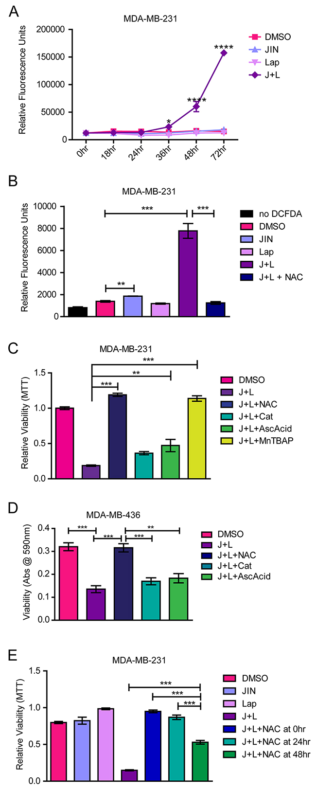 Figure 4: JNK-IN-8 and Lapatinib Cause Cell Death by Increasing Reactive Oxygen Species. (A) MDA-MB-231 cells were treated with either vehicle (DMSO), 3μM JNK-IN-8 (JIN) and/or 5μM lapatinib (Lap). ROS levels were assayed using 2’,7’ –dichlorofluorescein diacetate (DCDFA). Increased fluorescence indicates increased ROS. (B) Bar graph representing amount of ROS by DCDFA at 72 hours after treatment. 5mM NAC was used for ROS quenching. (C) MDA-MB-231 and (D) MDA-MB-436 cells were treated with DMSO, 3μM JIN and/or 5μM Lap, or JNK-IN-8 and lapatinib (J+L) with 5mM NAC, 500 U/mL catalase(Cat), 100μg/mL ascorbic acid (AscAcid), or 100μM MnTBAP for 72 hours in full media. Bar graphs represent viability by MTT assay. (E) NAC was either added at the same time as J+L (NAC at 0hr), 24 hours after J+L (NAC at 24hr), or 48 hours and after J+L (NAC at 48hr). Cell viability at 72 hours after addition of J+L was assayed using MTT.