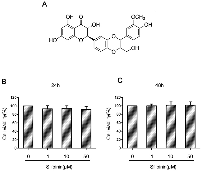 Figure 1: The chemical structure of silibinin and effect of silinibin on human OA chondrocyte viability. The chemical structure of silibinin was shown in (A). The cells were cultured with increasing concentrations of silibinin (0, 1, 10 or 50μM) for 24 h and 48h. The cell viability was determined by CCK-8 assay (B, C). The values are mean ± SD. * p < 0.05, ** p < 0.01 compared with control group, n=6.