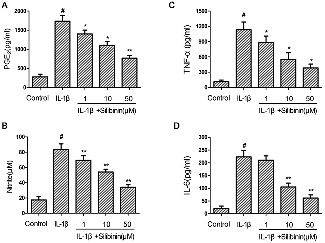 Effect of silibinin on IL-1β-induced NO, PGE2, TNF-α and IL-6 production in human OA chondrocytes
