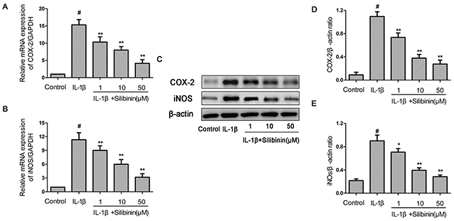 Figure 3: Effect of silibinin on IL-1β-induced iNOs and COX-2 expression in human OA chondrocytes. Human OA chondrocytes were pretreated for 2 h with various concentrations of silibinin (1, 10, 50 μM) and then stimulated or not stimulated with IL-1β (10 ng/ml) for 24 h. The mRNA expression levels of iNOs and COX-2 (A,B) were assayed by qRT-PCR. The protein expression levels of iNOs and COX-2 were determined by Western blot and quantification analysis (C-E). The values are mean ± SD. #p < 0.05 compared with control group, *p < 0.05, **p< 0.01 compared with IL-1β group. n=6