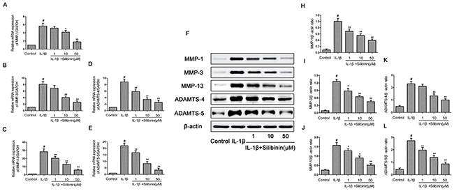 Figure 4: Effect of silibinin on IL-1β-induced MMP-1, MMP-3, MMP-13, ADAMTS-4 and ADAMTS-5 expression in human OA chondrocytes. Human OA chondrocytes were pretreated for 2 h with various concentrations of silibinin (1, 10, 50 μM) and then stimulated or not stimulated with IL-1β (10 ng/ml) for 24 h. The mRNA expression levels of MMP-1 (A), MMP-3 (B), MMP-13 (C), ADAMTS-4 (D) and ADAMTS-5 (E) were assayed by qRT-PCR. The protein expression levels of MMP-1, MMP-3, MMP-13, ADAMTS-4 and ADAMTS-5were determined by Western blot and quantification analysis (F-L). The values are mean ± SD. #p < 0.05 compared with control group, *p < 0.05, **p< 0.01 compared with IL-1β group. n=6