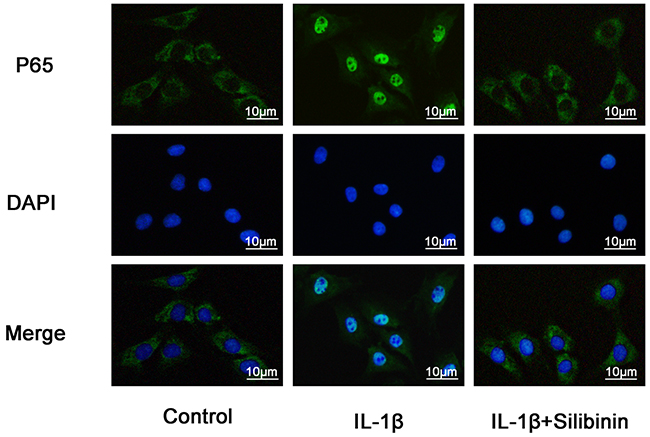 The effect of silibinin on NF-κB p65 nuclear translocation was examined by immunofluorescence in chondrocytes in response to NF-κB activation by IL-1β. Chondrocytes remained not stimulated or treated with IL-1β alone for 30 min or were co-treated with IL-1β and 50 μM silibinin for 30 min. Control chondrocytes showed the labeling of p65 mostly restricted in cytoplasm. Once IL-1β stimulated, chondrocytes revealed clear and enhanced nuclear staining for p65 and indicated nuclear translocation of the NF-κB p65 subunit. Nevertheless, silibinin resulted in inhibiting translocation of the p65 subunits into the nuclei and showed a decrease in activation of NF-κB (Figure 7). These immunofluorescent findings suggested silibinin is able to inhibit the nuclear translocation of NF-κB p65 in IL-1β-stimulated chondrocytes, which keeps consistent with the inhibitory effect of silibinin on NF-κB observed by Western blot.