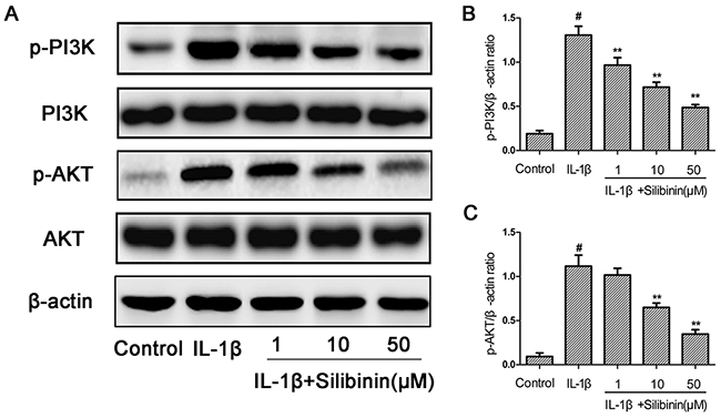 To further investigate the anti-inflammatory mechanism of silibinin, the effects of silibinin on IL-1β-induced PI3K/AKT phosphorylation were detected by Western blot analysis. As shown in Figure 8, IL-1β significantly increased the phosphorylation of PI3K and AKT compared to the control group. However, treatment of silibinin dose-dependently suppressed IL-1β-induced PI3K/AKT phosphorylation.