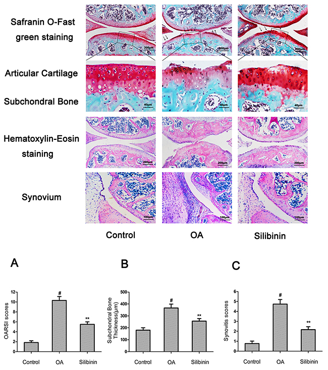 The mice were randomly divided into three groups of 10 mice to establish a sham control group (control), an osteoarthritis group (OA) and an osteoarthritis treated with silibinin group (silibinin). Mice OA models were made by DMM surgery. Silibinin was dissolved in 0.5% sodium carboxymethyl cellulose (0.5%CMC-Na). Mice in sham control group were made by sham operation. Mice in silibinin group received a gavage of silibinin (200mg/kg) daily for 8 weeks after surgery while mice in OA group received a gavage of vehicle (0.5%CMC-Na). Food and water were available ad libitum. Mice were maintained under a constant temperature of 20±2C°, a relative humidity of 50%±10%, and a 12 h light/dark cycle. All animals were sacrificed at 8 weeks after surgery. Knee joint tissues were collected for further evaluation.