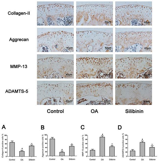 Figure 10: Effect of silibinin on cartilage matrix degradation in mice OA models. Mice were randomly divided into three groups: sham control group, OA group and silibinin group. Sham control group underwent sham operation, OA group and silibinin group were subjected to surgery for establishing OA models. After surgery, silibinin group received a gavage of silibinin (200 mg/kg) daily while OA group received a gavage of vehicle (0.5%CMC-Na) for 8 weeks. Immunohistochemistry of collagen-II, aggrecan, MMP-13 and ADAMTS-5 were assessed to the effect of silibinin on cartilage matrix degradation in mice OA models. Quantifcation of collagen-II, aggrecan, MMP-13 and ADAMTS-5-positive cells in cartilage samples (A-D). The values are mean ± SD. #p<0.05 compared with sham control group, *p <0.05 and **p< 0.01 compared with OA group. n = 10 for each group. Representative histologic images are shown.