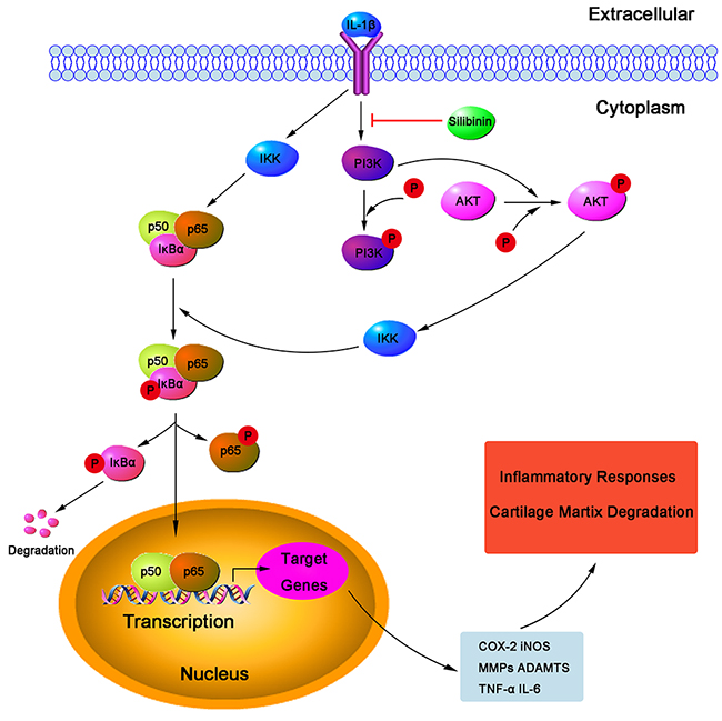 NF-kB is one of the inflammatory cytokine induced transcription factors with a vital role in regulating the expression of iNOS, COX-2, TNF-α, IL-6, MMPs and other cytokines as well as the regulation of plenty of inducible inflammatory genes in OA [34]. Normally, NF-kB is present in the cytoplasm in an inactive form combined with the inhibitory subunit IκBα. Once activated by IL-1β, IκBα is phosphorylated and degraded and NF-κB p65 translocates from the cytoplasm to the nucleus to trigger the expression of inflammation-related genes, including iNOS, COX-2, TNF-α, IL-6, MMPs and ADAMTS [35, 36]. Hence, blocking the activity of NF-kB may be effective therapeutically in OA. Previous reports showed that suppression of NF-κB activation had the ability to attenuate the progression of OA [37]. In addition, a study also reported that NF-κB p65-specific siRNA inhibited the expression of COX-2, iNOs and MMP-9 in IL-1β-induced chondrocytes [38]. Therefore, in our study, we also investigated molecular mechanisms by which silibinin inhibited inflammatory mediators in response to IL-1β in human OA chondrocytes. We found that silibinin significantly inhibited IL-1β-induced NF-κB activation and IκBα degradation in human OA chondrocytes. Furthermore, silibinin reversed the translocation of NF-κB p65 from cytoplasm to nucleus when detected by immunofluorescence staining. Our results are partly supported by Yun et al. who found that silibinin inhibited the production of pro-inflammatory cytokines through inhibition of NF-κB signaling pathway in HMC-1 human mast cells [14]. Besides, silibinin suppressed the nuclear translocation of NF-κB and phosphorylation of IκBα in lung tissues of allergic mice [17]. The intracellular signaling pathway PI3K/Akt has also been demonstrated to be involved in both cellular and ECM alterations in OA pathogenesis [39]. Activation of the PI3K/Akt pathway can increase MMPs production by chondrocytes via its multiple downstream target proteins such as NF-κB. Moreover, inhibition of the PI3K/Akt pathway has been considered as an option for the treatment of OA. Indeed, inhibition of p-Akt and NF-κB by curcumin decreased IL-1β stimulating MMPs secretion and COX-2 expression in chondrocytes [40]. In our study, we found that silibinin greatly suppressed IL-1β-induced PI3K/Akt phosphorylation in human OA chondrocytes, which was partly supported by the previous study showing that silibinin exerted inhibtory effects on 12-O-tetradecanoylphorbol-13-acetate-induced skin inflammation via inhibiting PI3K/Akt signaling pathway [41]. Taken together, the previous studies together with our findings suggest that silibinin inhibited IL-1β-induced inflammatory response through suppressing the PI3K/Akt phosphorylation and NF-kB activation in human OA chondrocytes and the underlying mechanisms was illustrated specifically in Figure 11. However, further studies are needed to clarify the exact mechanism of the regulation of silibinin on the inflammatory process in human chondrocytes.