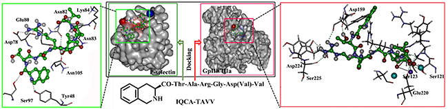 Figure 1: Docking features of IQCA-TAVV in the active site of P-selectin (green box) and GPIIb/IIIa (red box).