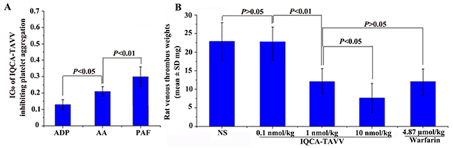 As mentioned above the platelet activation is of critically importance for venous thrombosis. To estimate the value of IQCA-TAVV as the thrombotic inhibitor the in vitro anti-platelet aggregation assays were performed. Figure 4A indicates that the IC50 values of IQCA-TAVV inhibiting rat platelet aggregation induced by AA (final concentration 350 μM), adenosine diphosphate (ADP, final concentration 10 μM) and platelet activating factor (PAF, final concentration 0.1 μM) are 0.21 nM, 0.13 nM and 0.30 nM, respectively. The IC50 values fall within a range of 0.13 nM to 0.30 nM means that IQCA-TAVV is a powerful anti-platelet aggregation agent. Of the three aggregators ADP is the most sensitive aggregator to IQCA-TAVV.