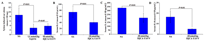As mentioned above, inflammation is implicated in VTE either as a cause or as a consequence. To explore the effect of IQCA-TAVV on inflammation the xylene-induced ear edema model of mice was practiced. Figure 5A shows that the ear edema of the mice orally treated with 10 nmol/kg of IQCA-TAVV is significantly lower than that of the mice treated with NS, and is equal to that of the mice treated with 1.1 mmol/kg of aspirin. The comparison suggests that the anti-inflammation activity of IQCA-TAVV is 110000 folds higher than that of aspirin. Therefore IQCA-TAVV is a powerful inflammatory inhibitor.