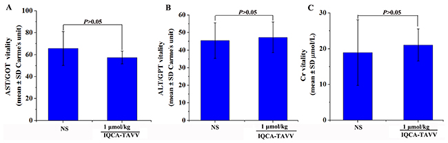 Figure 6: Effects of IQCA-TAVV on mouse Cr, ALT and AST. (A) Serum Cr of ICR mice treated with NS and 1 μmol/kg of IQCA-TAVV (n=5); (B) Serum ALT of ICR mice treated with NS and 1 μmol/kg of IQCA-TAVV (n=5); (C) Serum AST of ICR mice treated with NS and 1 μmol/kg of IQCA-TAVV (n=5).