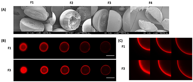 Figure 1: (A) SEM images of solid microparticle (F1) and hollow microparticles (F2-F4). (B) z-stack comprising five confocal sections was obtained for DOX (red) of F1 and F3. Scale bar = 30 μm. (C) z-stack comprising three zoomed-in confcoal sections of F1 and F3.