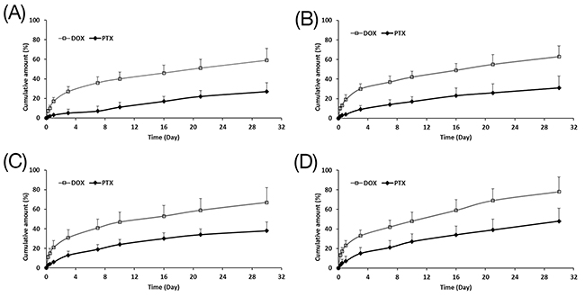 Figure 2: Cumulative release of DOX and PTX from (A) F1, (B) F2, (C) F3 and (D) F4 up to 30 days (n=3, mean ± S.D).