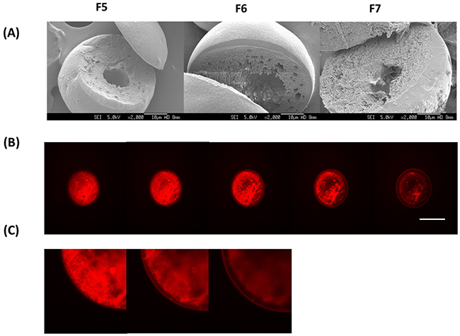 Figure 3: (A) SEM images of MCD-incorporated microparticle (F5-F7). (B) z-stack comprising five confocal sections was obtained for DOX (red) of F6. Scale bar = 30 μm. (C) z-stack comprising three zoomed-in confcoal sections of F6.