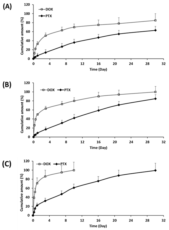 Figure 4: Cumulative release of DOX and PTX from (A) F5, (B) F6, and (C) F7 up to 30 days (n=3, mean ± S.D).