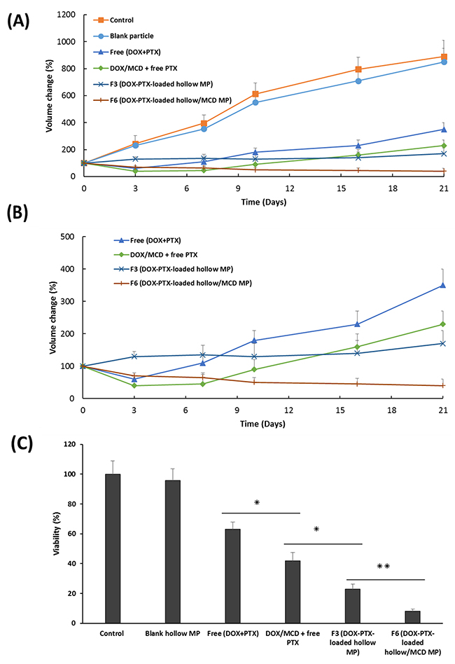 Having established the influence of cavity size on drug release rates in hollow microparticles, MCD was next introduced into the hollow microparticles. MCD is reported to enhance the anti-tumor effects of DOX through the depletion of membrane cholesterol in cells, and the aim here is to evaluate the hypothesis that drug-loaded hollow microparticles with MCD would achieve better tumor shrinkage while improving cumulative release. Here, sample F3 was chosen for further development, with varying amounts of MCD (29.4, 58.8 or 88.2 mg). The corresponding EE of these DOX/MCD-PTX microparticles is summarized in Table 1 (i.e. samples F5 to F7).