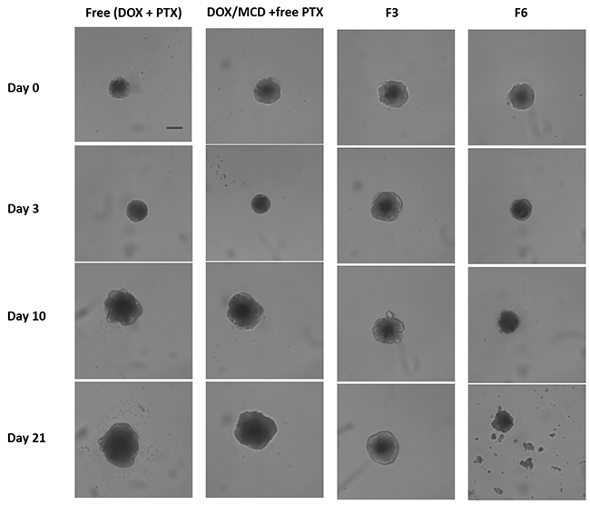 Figure 6: Bright-field images of MCF-7 spheroids treated with free (DOX + PTX), DOX/MCD + free PTX, F3, or F6 (at 100 ng/mL DOX and 20 ng/mL PTX). Scale bar = 200 μm.