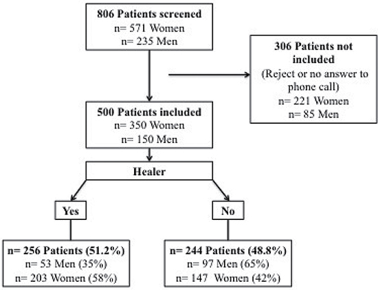 Among the 806 patients screened for this study, 500 patients were included: 350 women and 150 Men. 306 patients could not be included due to refusal or no answer to phone call (three attempts). The flow chart (Figure 1) summarizes patient’s inclusion.