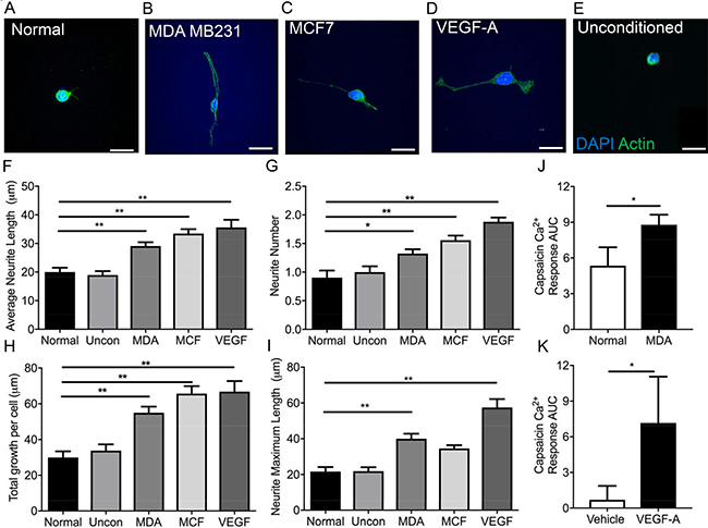 Figure 3: MDA MB231 and MCF7 breast cancer cell lines induce sensory neuronal growth. A sensory neuronal cell line (A) 50B11 was exposed to conditioned media from (B) MDA MB231 and (C) MCF7 breast cancer cell lines as well as (D) VEGF-A and (E) unconditioned media. Scale bar = 20 μm. Conditioned media from MDA MB231 and MCF7 as well as VEGF-A165a led to an increase in the (F) average neurite length, (G) increased neurite number and (H) total growth per cell. (I) MDA MB231 conditioned media and VEGF-A165a led to increased maximum neurite length. (J) MDA MB231 conditioned media treated DRG sensory neurons had an increased capsaicin responses when compared to normal media treated DRG sensory neurons. Furthermore, (K) VEGF-A165a increased capsaicin induced sensory DRG neuronal responses versus vehicle treated DRG neurons (n = 8 per experimental group). *P < 0.05, **P < 0.01, ***P < 0.001 Unpaired T test or Kruskal Wallis with Dunns multiple comparison. Scale bar = 20 μm.