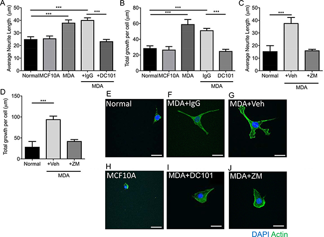 Inhibition of VEGFR2 with DC 101 (rat monoclonal antibody), led to the inhibition of MDA MB231 conditioned media induced neuritogenesis demonstrated by reduced individual neurite length (Figure 4A; Normal = 25.04 ± 1.94 μm; MCF10A = 25.67 ± 1.89 μm; MDA MB231 = 38.1 ± 2.23 μm; MDA MB231+IgG = 40.19 ± 1.82 μm; MDA MB231+DC101 = 23.39 ± 1.43 μm) and total neurite growth (Figure 4B; Normal = 28.71 ± 2.95 μm; MCF10A = 26.79 ± 3.92 μm; MDA MB231 = 59.21 ± 5.92 μm; MDA MB231+IgG = 47.03 ± 2.72 μm; MDA MB231+DC101 = 25.04 ± 2.84 μm). In addition, MCF10A, a normal epithelial breast cell line, conditioned media did not induce neuritogenesis of the sensory neurons (Figure 4A, 4B). Additionally, the VEGFR2 tyrosine kinase inhibitor ZM323881 was used to inhibit MDA MB231 conditioned media induced sensory neuron growth; average neurite length (Figure 4C; Normal = 15.46 ± 4.46 μm; MDA MB231+Vehicle = 37.81 ± 4.47 μm; MDA MB231+ZM323881 = 16.13 ± 0.90 μm) and total sensory neuron growth (Figure 4D) was reduced with ZM323881 treatment (Representative examples of sensory neurons cultured in Figure 4E Normal; Figure 4F MDA MB231+IgG; Figure 4G MDA MB231+`vehicle; Figure 4H MCF10A; Figure 4I MDA MB231+DC101; Figure 4J MDA MB231+ZM323881).
