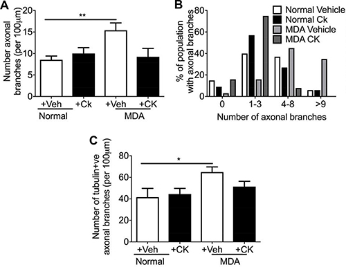Sensory neuron average neurite length was increased by incubation with MDA MB231 conditioned media versus control (Figure 7A), with co-treatment of MDA MB231 conditioned media with CK666 leading to a significant reduction in average neurite length (Figure 7A; Figure 7B; MDA MB231+Veh = 57.20 ± 4.54 μm; MDA MB231+CK666 = 34.50 ± 7.22 μm; MCF+Veh = 53.68 + 4.45 μm; MCF+CK666 = 25.94 ± 3.06 μm), compared to normal media. There was no change in neurite length in normal treatment treated with CK666 (Figure 7A). MCF-7 induced neurite growth was also inhibited by CK666 treatment (Figure 7A). Both MDA MB231 and MCF-7 induced neurite growth cone area were inhibited by CK666 treatment (Figure 7B; MDA MB231+Veh = 61.66 ± 6.07 μm2; MDA MB231+CK666 = 26.08 ± 2.97 μm2; MCF+Veh = 71.81 ± 10.63 μm2; MCF+CK666 = 28.94 ± 4.19 μm2), with normal media being unaffected by CK666 treatment (Figure 7B). Tortuosity of actin filaments were reduced by CK666 treatment in MDA MB 231 and MCF-7 conditioned media treated neurons (Figure 7C; MDA MB 231+Veh = 0.64 ± 0.03 Tortuosity ratio; MDA MB 231+CK666 = 0.77 ± 0.01 Tortuosity ratio; MCF+Veh = 0.62 ± 0.03 Tortuosity ratio; MCF+CK666 = 0.76 ± 0.01 Tortuosity ratio). Representative images of all experimental groups ± CK666 (Figure 7D normal ± vehicle; Figure 7E MDA MB231 ± Vehicle; Figure 7F MCF7 ± Vehicle; Figure 7G Normal ± CK666; Figure 7H MDA MB231 ± CK666; Figure 7I MCF7+CK666). MDA MB231 induced collateral neurite branch formation was decreased by ARP2/3 inhibition through CK666 inhibition (Figure 8A, 8B; Representative images of all experimental groups (Figure 9). Additionally, this was represented by a CK666 inhibition of MDA MB 231 induced increase in the number of collateral branches per neurite (Figure 8A; MDA MB231+Veh = 15.42 ± 1.68 vs MDA MB231+CK666 = 9.25 ± 1.93). There was no difference when comparing vehicle and CK666 treatment in normal media (Figure 8A, 8B). MDA MB231 led to an increase in the number of collateral branches that were positive for tubulin (Figures 8C, 9A–9N) therefore these were classified as mature axonal collateral branches as previously termed [28]. CK666 inhibited MDA MB 231 induced tubulin positive collateral branch formation (Figures 8C, 9G–9P; MDA MB231+Veh = 64.97 ± 4.67% vs MDA MB231+CK666 = 51.39 ± 4.85%).