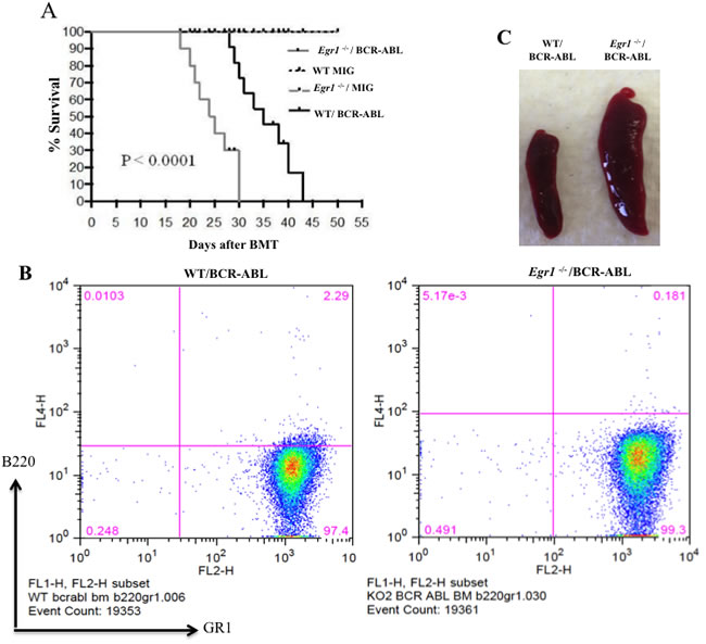 Figure 2: Loss of Egr1 accelerated CML development in mice. A. Kaplan-Meier survival curves for recipients of MIGR1 or MIG BCR-ABL-transduced BM cells from WT or Egr1-/- donor mice. WT recipient mice were transplanted with BCR-ABL-expressing BM or MIGR1-expressing BM. Following transplantation, animals were observed for signs of disease and euthanized at first signs of morbidity. Statistical analysis used was Log-rank (mantel-Cox) test, P value < 0.0001. Egr1-/-/BCR-ABL (n = 8) median survival 24.5 days, WT/BCR-ABL (n = 9) median survival 35 days. WT MIG (n = 4) and Egr1-/- MIG (n = 4). Animals transplanted with MIGR1-infected BM did not show any signs of leukemia and were euthanized at the end of the experiments. B. Most leukemic mice exhibited myeloid disease. GFP+ BM cells harvested from leukemic mice when they exhibited signs of leukemia were prepared for antibody treatment, and incubated with anti-mouse Gr-1 and B220 antibodies. Following Facs, data analysis was performed using FloJo software. (Although all gates were not drawn at the 102 positions on the y-axis, the cell populations are clearly observed and this does not impede the interpretation of the data). Eight to ten mice were analyzed from each genotype, and most of them (75-80%) developed myeloid leukemia. C. Representatives spleens of mice transplanted with either WT/BCR-ABL or Egr1-/-/BCR-ABL BM cells at 18 days post-BMT. Spleens were removed from mice transplanted with either WT/BCR-ABL or Egr1-/-/BCR-ABL BM cells following euthanasia at 18 days post-BMT.