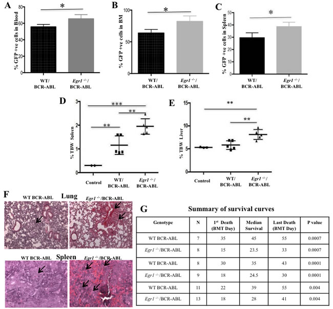 Figure 3: Loss of Egr1 accelerated CML development in mice. Lethally irradiated WT recipient mice were transplanted with BM from WT or Egr1-/- mice infected with BCR-ABL-containing retrovirus as detailed above. For panels A., B. and C., mice were euthanized when moribund. Facs analysis was done on peripheral blood (A), BM (B) and spleen cells (C) to assess % GFP+ cells. (A), P value = 0.0442; (B), P value = 0.0370; (C), P value = 0.0442. WT/BCR-ABL n = 6, Egr1-/-/BCR-ABL n = 5. D. & E. Mice were euthanized 20 days after BMT, and spleen, liver and total body weight were determined. Mice transplanted with MIGR1-infected BM were used as controls. Values plotted represent the ratio of spleen or liver weight to total body weight (TBW). (D) Analysis of spleen weight. Spleens of Egr1-/-/BCR-ABL -transplanted mice were significantly larger than in controls and in WT/BCR-ABL-transplanted mice. %TBW spleen: Egr1-/-/BCR-ABL vs. WT/BCR-ABL- p value = 0.008; WT/BCR-ABL vs. Control - p value = 0.0075; Egr1-/-/BCR-ABL vs. Control - p value = 0.0002. (E) Analysis of liver weight. Livers of Egr1-/-/BCR-ABL -transplanted mice were significantly larger than those of animals transplanted with WT/BCR-ABL BM cells. %TBW liver: Egr1-/-/BCR-ABL vs. WT/BCR-ABL - significant, p value = 0.0080; WT/BCR-ABL vs. Control - not significant, p value = 0.4163; Egr1-/-/BCR-ABL vs. Control - Significant, p value = 0.0053. Control (n = 3), WT/BCR-ABL (n = 5), Egr1-/-/BCR-ABL (n = 5); F. H&E stained slides obtained from organs of leukemic mice showed more extensive infiltration of leukemic cells in Egr1-/-/BCR-ABL BM-transplanted mice compared to WT counterparts, in spleen and lungs. No clear infiltration of leukemic cells in the livers in either of the genotypes was observed. Five slides from organs from 3 mice for each genotype were examined; photograph is representative of what was observed for each genotype. Mice were displaying signs of leukemia when euthanized. Arrows indicate infiltration of leukemic cells. (10 X magnification). G. Summary of survival curves. Kaplan-Meier survival curves for recipients of MIGR1 or MIG BCR-ABL-transduced BM cells from WT or Egr1-/- donor mice.