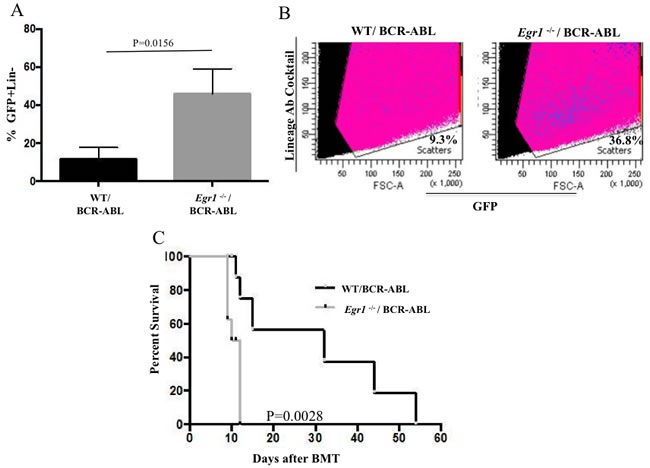 Figure 6: Loss of Egr1 increased leukemia initiating cells. A.-B. The leukemia stem cells are enriched in BM from mice transplanted with Egr1-/-/BCR-ABL BM compared to WT/BCR-ABL BM. BM was harvested 20 days post BMT. Representative Facs data of GFP+Lin- cells from one of the mice analyzed for each genotype. P value = 0.0156. (n = 3 for each genotype) C. BM from primary transplanted mice was harvested on day 14 post BMT and red blood cells were lysed. 1x106 BM cells from primary transplanted mice were injected into lethally irradiated secondary recipient mice, and Kaplan-Meier survival curves for recipients are shown. Statistical analysis was performed using Log-Rank (Mantel-Cox) test. P value = 0.0028. Median Survival: WT/BCR-ABL 32 days; Egr1-/-/BCR-ABL 11 days. WT/BCR-ABL (n = 6) and Egr1-/-/BCR-ABL (n = 7).