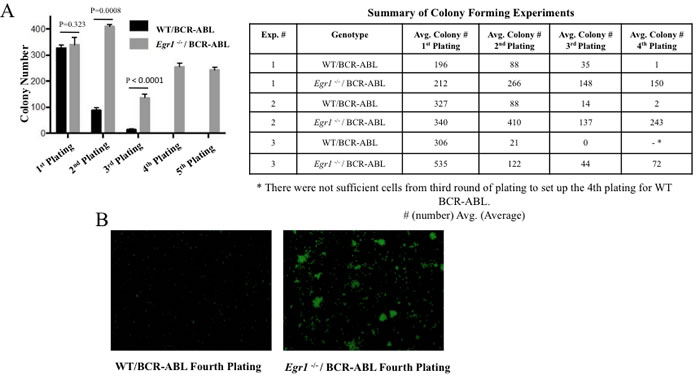 WT and Egr1-/- BM expressing BCR-ABL were obtained following infection of appropriate BM with the MSCV-IRES-BCR-ABL-GFP vector, as described in section “Bone Marrow Transduction and Transplantation” followed by sorting to select for GFP+ expression. The cells were suspended in IMDM with 2% FBS at a concentration of 2 x 105 cells/ml. Then, 0.4 ml of this cell suspension was added to 4 ml of MethoCult (StemCell Technologies). Cells were mixed thoroughly and 1.1ml of MethoCult + cells was dispensed into each 35 mm dish. Final cell concentration was 2x104 cells/dish. Dishes were incubated at 37°C, 5% CO2, with ≥95% humidity for 8-12 days to allow colonies to form. Colonies were then counted; the cells were rinsed with PBS, counted and replated in new media at a concentration of 2 x 104 cells/dish to test their ability to form colonies upon secondary plating. This process was repeated as indicated for each experiment.