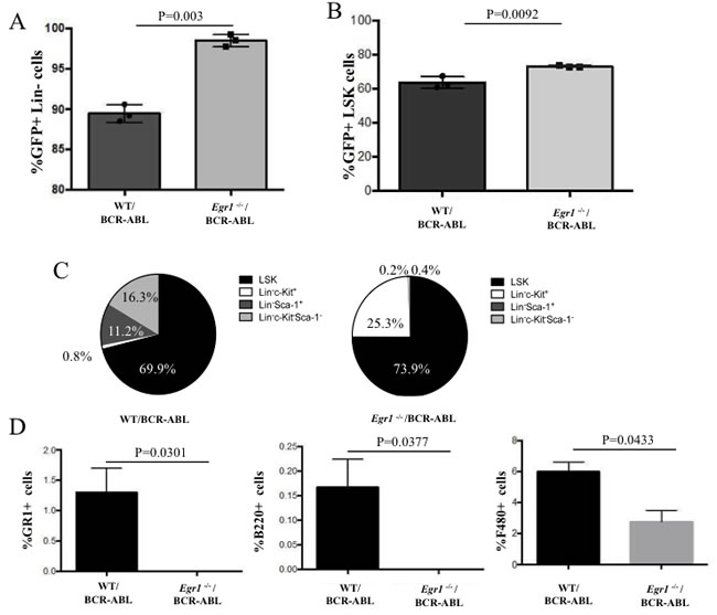 Egr1-/-/BCR-ABL BM transplanted mice are enriched in leukemia stem cells (LSCs) compared to WT counterparts