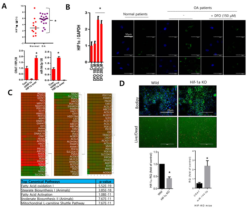 Figure 6: HIF-1α might regulate the CRAT:miR-144-3p axis. A. The HIF-1α expression level was analyzed by PCR in normal or osteoarthritis chondrocytes (upper panel). Normal chondrocytes were infected with lentiviruses containing HIF-1α-specific siRNA (siHIF-1α) or HIF-1α, and the expression levels of CRAT and miR-144-3p were analyzed by PCR (lower panel). B. Osteoarthritis chondrocytes were treated with desferrioxamine (DFO) and stained with BODIPY. C. Peroxisomal gene profiles were analyzed and represented as a heat map (upper panel). The IPA generated top canonical pathways, and possible upstream regulators are shown (lower panel). D. Articular chondrocytes isolated from HIF-1α knock-out mice were stained with BODIPY and live and dead assay kit (upper panel) and the expression levels of HIF-1α, CRAT, and miR-144-3p was analyzed by PCR. Bars represent the mean ± SD of three individual experiments. *P < 0.05 versus control.