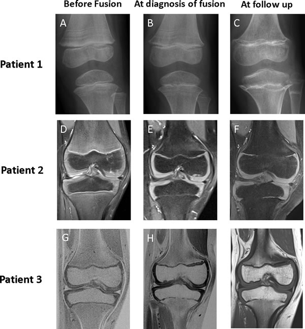 Figure 1: Imaging of knee in patients 1, 2, and 3 before fusion, at diagnosis of fusion, and at follow up. Baseline imaging (Panels A, D, and G) show patent physes in all patients at the start of vismodegib therapy. In patient 1, physeal fusions were initially more pronounced in the proximal tibia, incomplete in the distal femur, and absent in the proximal fibula (Panel B). Follow-up radiography 17 months after stopping therapy (Panel C) showed progression of fusions in all physes and development of abnormal metaphyseal sclerosis. In patients 2 and 3, MRI showed that the initial identification of fusion was subtle, with the development of small bridging fusions at the completion of 12 cycles of vismodegib therapy (Panels E and H). Over time, these bridges widened to occupy more of the physeal stripe, as revealed by the MRI taken 6 months after the completion of vismodegib therapy (Panels F and I).