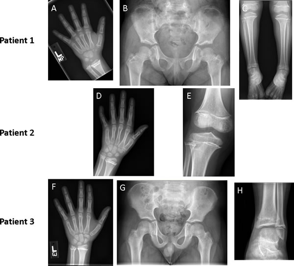 Figure 2: Imaging of patients at follow up showing skeletal deformities resulting from widespread physeal fusions. Radiographs of patient 1 at 18 months after cessation of therapy show protrusion of the ulnar head and widespread physeal fusion in hand bones (Panel A); abnormally short femoral necks (Panel B); and varus ankles, with widespread physeal fusions of bones in the lower leg (Panel C). Radiographs of patient 2 at 14 months after completion of vismodegib therapy show widespread physeal fusions in hand and forearm bones (Panel D) accompanied by sclerotic thickening in all physes of the knee (Panel E). Three radiographs of patient 3 taken 16 months after cessation of therapy show abnormalities that are less prominent but similar to those of patient 1. Advanced bone age (Panel F), shortened femoral necks (Panel G), and distal fusion of the tibia with relative sparing of the fibula (Panel H) was seen.